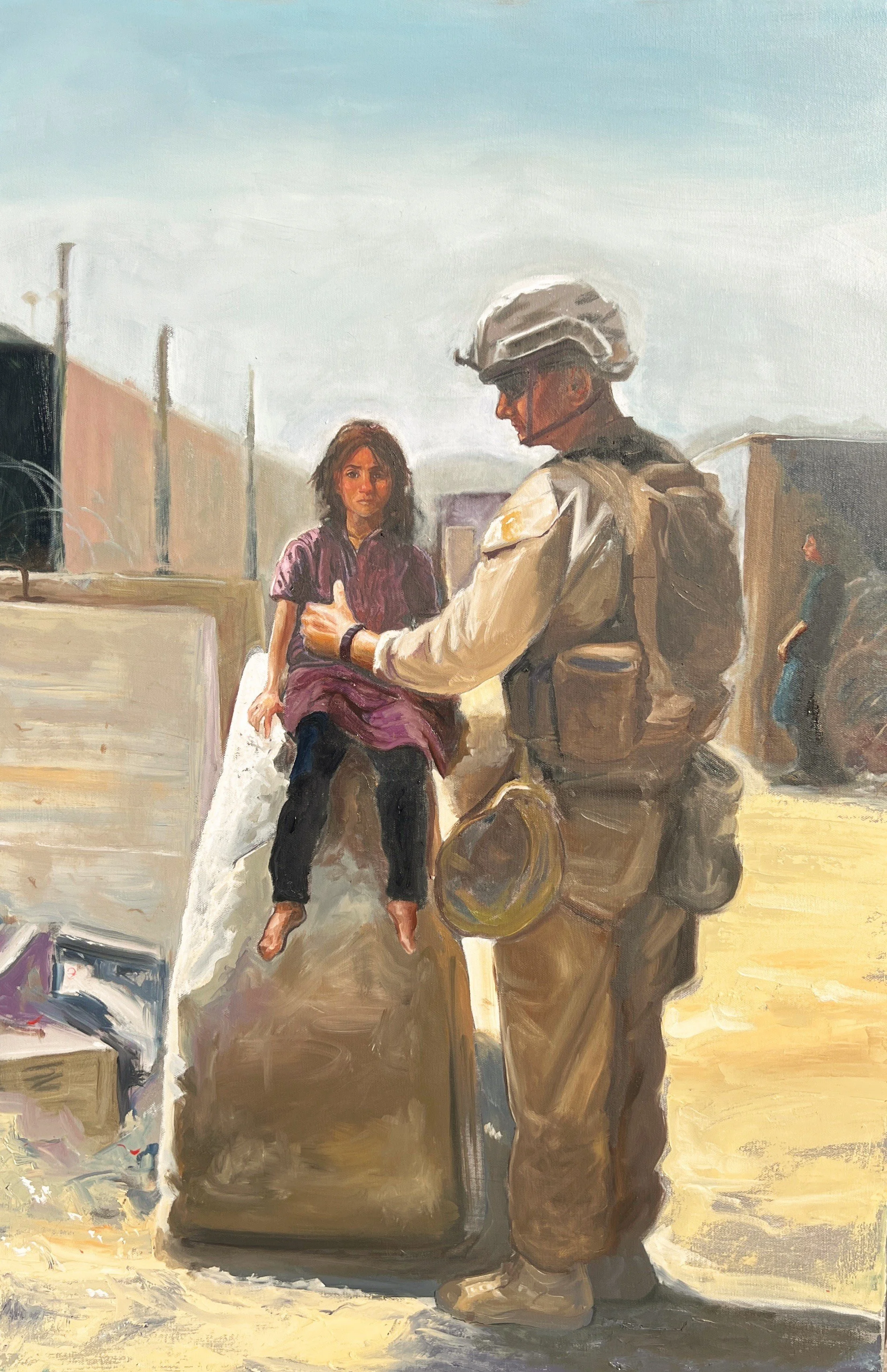 ‘Misplaced’ Oil on Canvas M. L. Reynolds (2025). A US Marne assigned to 1st Battalion 8th Marines tends to an Afghan girl at he Abbey Gate during the US withdrawl from Afghanistan at HKIA.